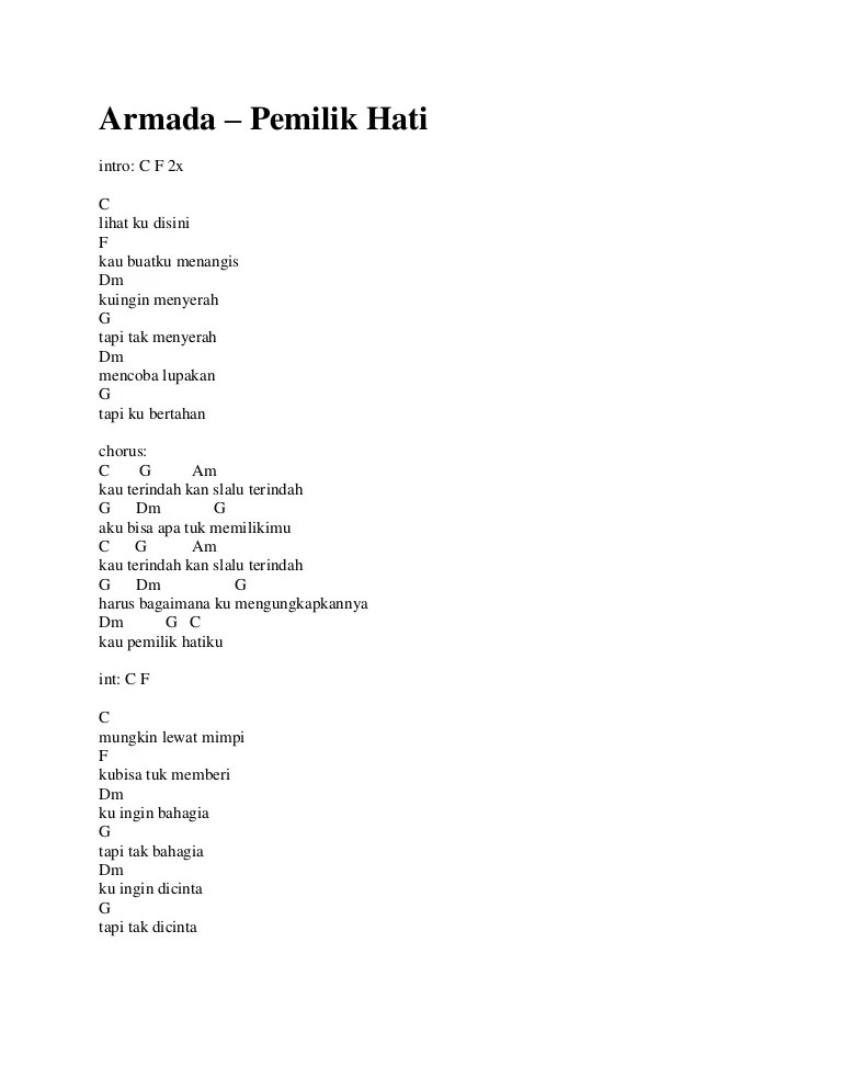 Lihat ku di sini kau buatku menangis. Dm g mencoba lupakan tapi ku bertahan. Lagu 'pemilik hati' ini juga terdapat dalam album armada yang bertajuk 'hal terbesar'. Dm g kuingin menyerah tapi tak menyerah. Berikut dibawah ini adalah lirik lagu dari armada simak liriknya; Lihat ku disini kau buatku menangis dm g kuingin menyerah tapi tak menyerah dm g mencoba lupakan tapi ku bertahan. Kau terindah kan selalu terindah Lihat ku disini kau buat ku menangis tak ingin menyerah tapi tak menyerah mencoba lupakan tapi ku bertahan reff: Kau terindah kan selalu terindah Lihat ku di sini kau buatku menangis. G tapi ku bertahan chorus c g am